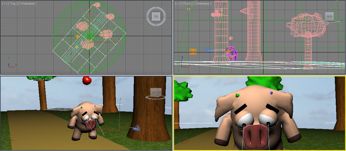 This is a short scene in which Pigham looks sad, before the apple he was after falls off the tree and lands on his head. I simply just manipulated the biped and eyes to make Pigham look sad. When the apple lands on his head, I made him jump slightly, as most people would do if something hard suddenly hit them on the head.